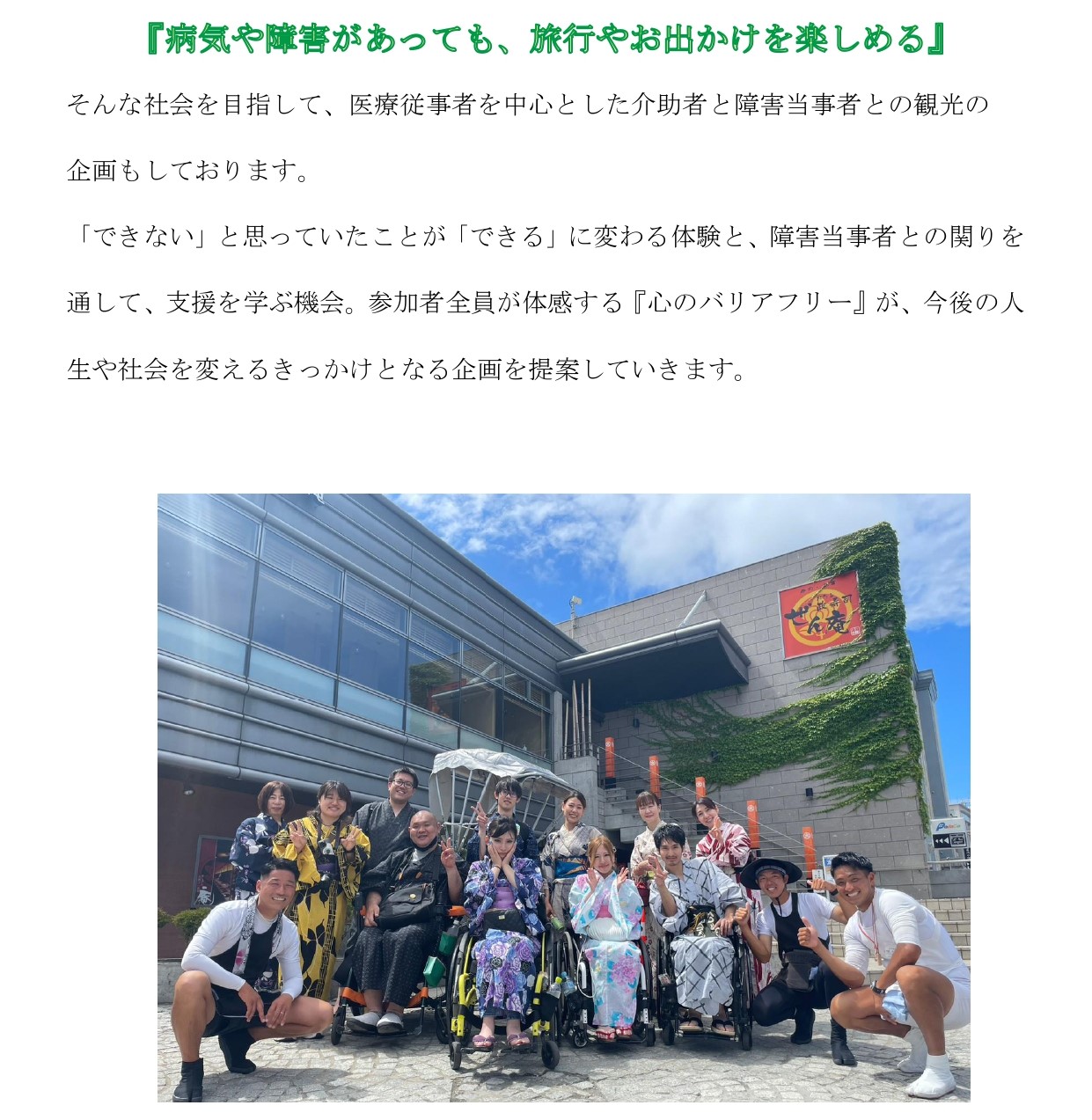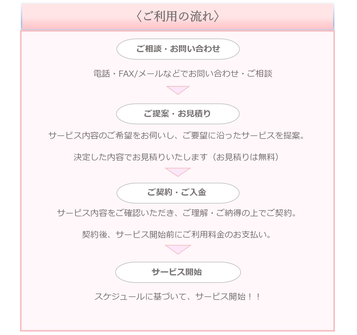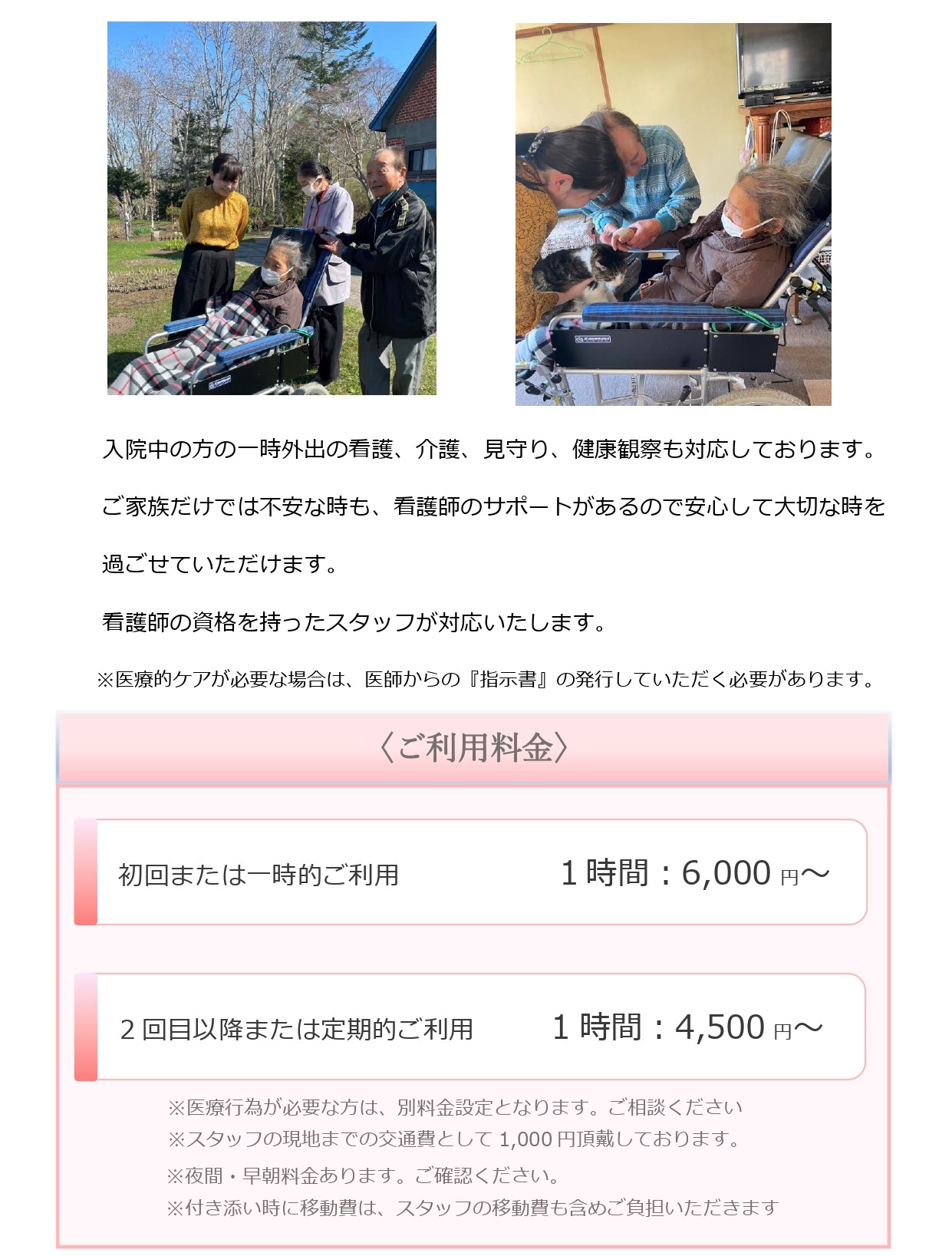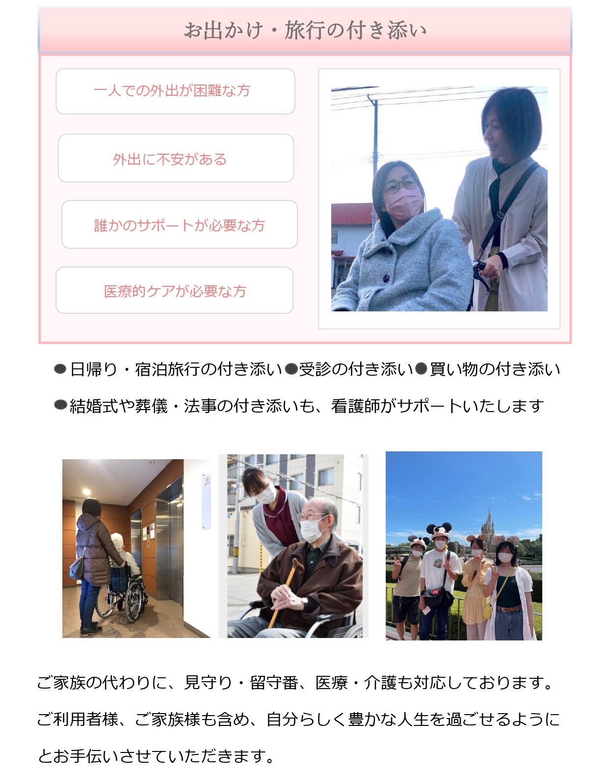 「できない」と諦めていませんか? 辛いこと我慢しすぎていませんか? 誰かのサポートがあれば「できる」になるかもしれない。                     辛いことも少し軽減するかもしれない。 誰にも頼むことが出来ない。。  公的保険サービスでは受けられない。 そんな方々に、お困りごとをサポートする看護師の自費サービスです。「外出に不安がある方」「お一人での外出が困難な方」「ご病気などで誰かのサポートを必要とされる方」などのお出かけの付き添い、病院受診の付き添い、結婚式や葬儀・法事の付き添いも、看護師がサポートいたします。 介護や看護、育児をしているご家族様の代わりに医療・介護の提供や、見守り・留守番も対応しております。  ご利用者様、ご家族様も含めて自分らしく豊かな人生を過ごしていただけるようサポートいたします。