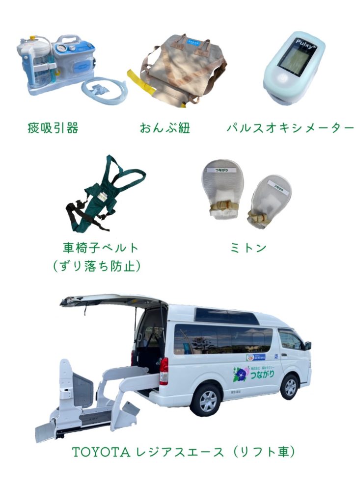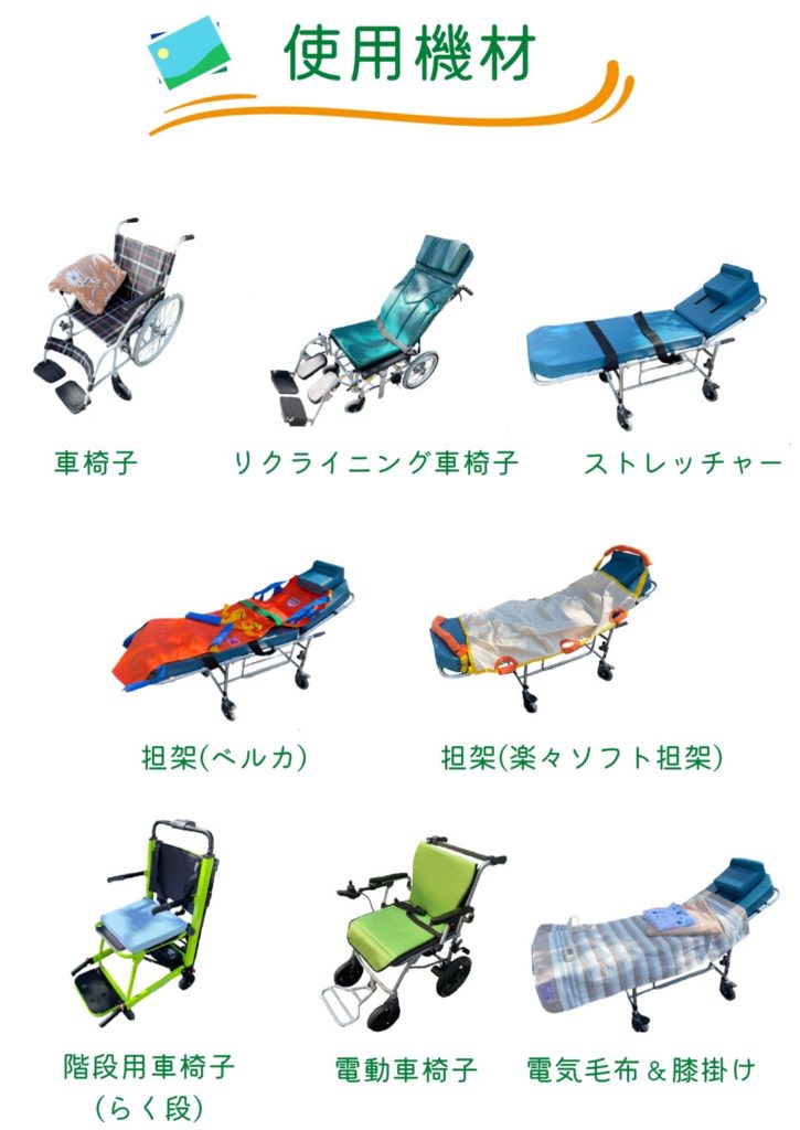 心に、そして記憶に残るお客様の大事なご旅行のお手伝いをさせて頂きます。ストレッチャー、リクライニング、手動車椅子、電動車椅子、階段昇降機、100V家庭用、ベルカ担架、おんぶ担架、酸素ボンベ、吸引器、看護士手配可、車椅子2台可、同乗健常者3名+車椅子2名可、昭和演歌名曲あり、写真撮影可、ご要望やニーズをお聞かせ頂ければ旅行計画も提案させて頂きます。
